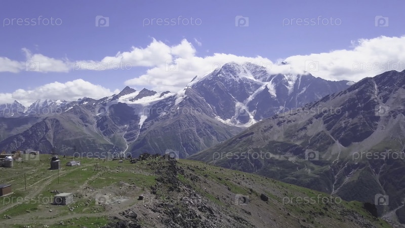 Вид сверху обсерватории на фоне гор летом. Клип. Исследовательская станция, расположенная посреди гор со снежными вершинами