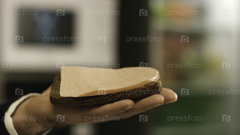 Ближайший снимок руки мужчины, держащего кусок ржаного хлеба Borodino с куском колбасы доктора, падающей на него