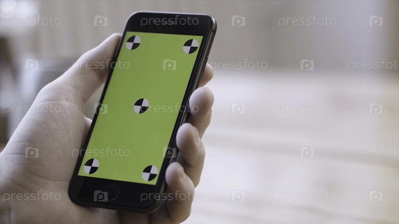 Ключевой экран Chroma для размещения собственного контента. Стоковые кадры. Ближайший план красивой молодой женщины, сидящей за деревянным столом и держащей iPhone с зеленым экраном chroma key