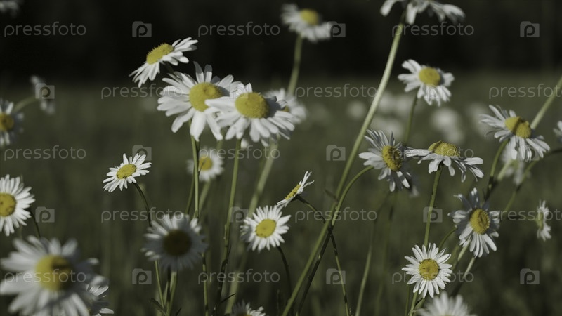 Красивые ромашки на лугу в ясный солнечный день.Креативные. Близкий план ярких ромашек на луге на фоне солнечного дня.Ностальгические цвета с ромашками на лугу