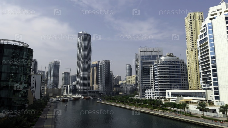 Панорамный вид на высокие здания со стеклянным фасадом. Действие. Бизнес с недвижимостью в Объединенных Арабских Эмиратах и водный канал