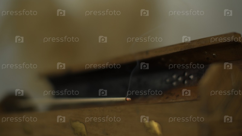 Дым индийской ароматической бутылки. СМИ. Ароматная палочка на стенде в йога-студии. Близкая индийская ароматная палка создает уютную атмосферу
