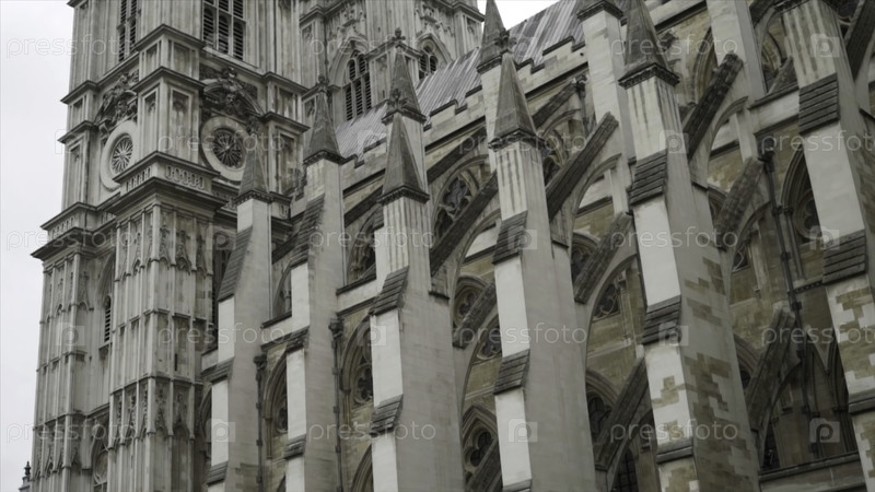 Вид снизу на внешние детали Вестминстерского аббатства против серого облачного неба.Это большая, в основном готическая аббатская церковь в Сити-Вестминстере, Лондон
