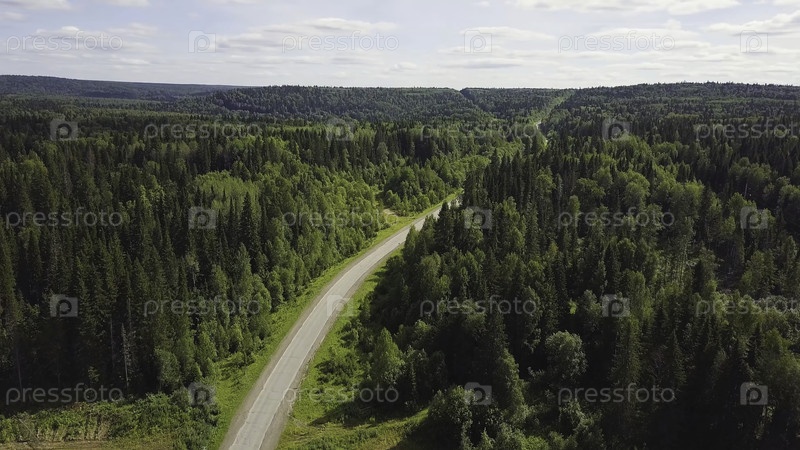 Взгляд с воздуха на белую машину, едущую по сельской дороге в лесу.Взгляд с воздуха летающий над старой исправленной двухполосной лесной дорогой с движущейся машиной зеленые деревья густой древесины, растущие с обеих сторон.Вождение автомобиля вдоль лесно
