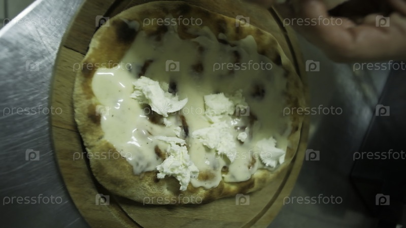 Процесс приготовления пиццы. клип. шеф-повар кладет сыр на пиццу