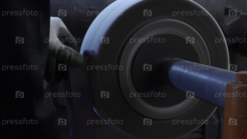 Ближайшее изображение шлифовальной машины с вращающимся диском быстрой полировки. Креативное. Металлические детали производства на фабрике. Концепция производства, промышленности и технологии