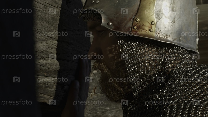 Старый средневековый рыцарский шлем и цепь для защиты в бою.СМИ. Близкий вид с бока человека в очень тяжелом головном уборе, концепция брони Средних веков