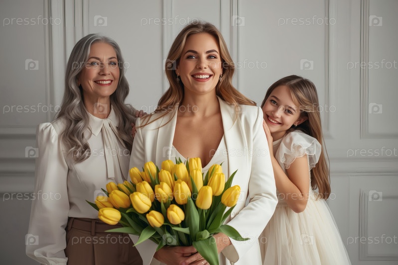 Концепция праздника, посвященного Международному женскому дню 8 марта.Три поколения женщин.Молодая женщина, несущая букет тюльпанов, в сопровождении пожилой матери и маленькой дочери