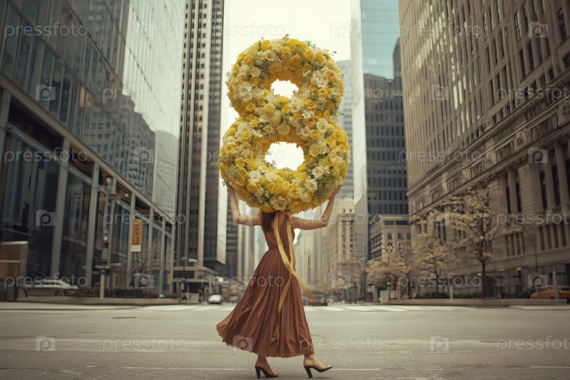 Концепция праздника, посвященного Международному женскому дню 8 марта.Женщина в платье держит огромную цветочную восьмерку на городской улице, окруженной небоскребами