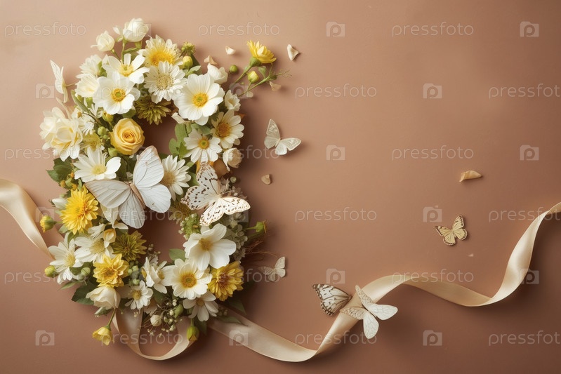 Международный женский день. баннер, флаер, красивая открытка на 8 марта. цветы в форме цифры восемь и бабочки на простом фоне