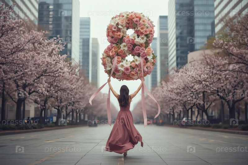 Концепция праздника, посвященного Международному женскому дню 8 марта.Женщина в платье держит огромную цветочную восьмерку на городской улице, окруженной небоскребами
