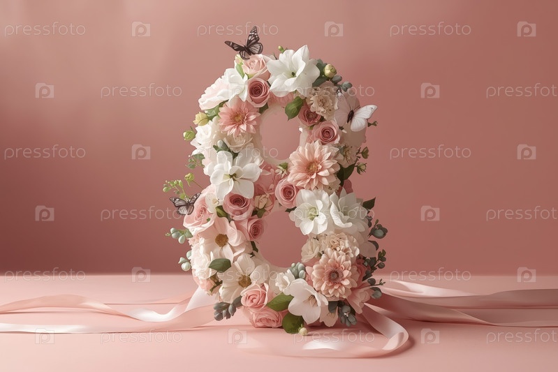 Международный женский день. баннер, флаер, красивая открытка на 8 марта. цветы в форме цифры восемь и бабочки на простом фоне