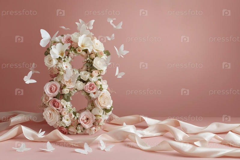 Международный женский день. баннер, флаер, красивая открытка на 8 марта. цветы в форме цифры восемь и бабочки на простом фоне