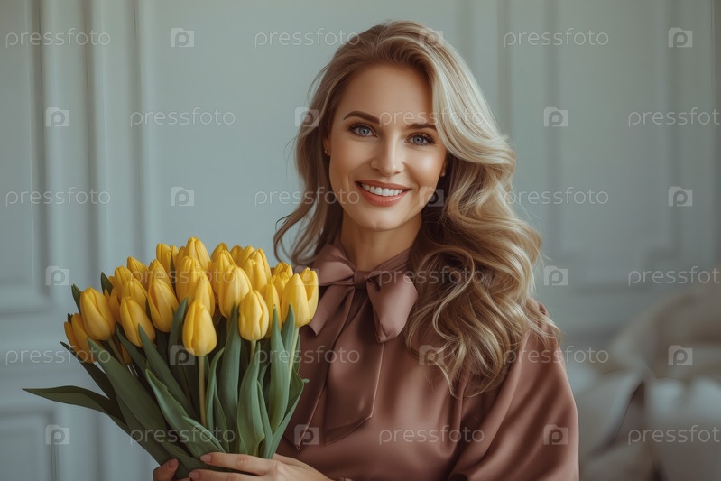 Концепция праздника, посвященного Международному женскому дню 8 марта.Молодая женщина в элегантном платье с луком держит букет желтых тюльпанов в ярком интерьере
