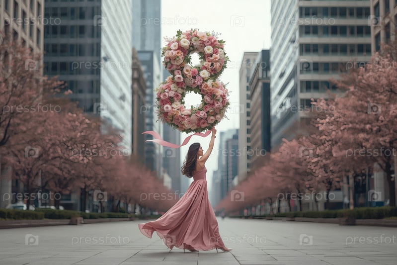 Концепция праздника, посвященного Международному женскому дню 8 марта.Женщина в платье держит огромную цветочную восьмерку на городской улице, окруженной небоскребами