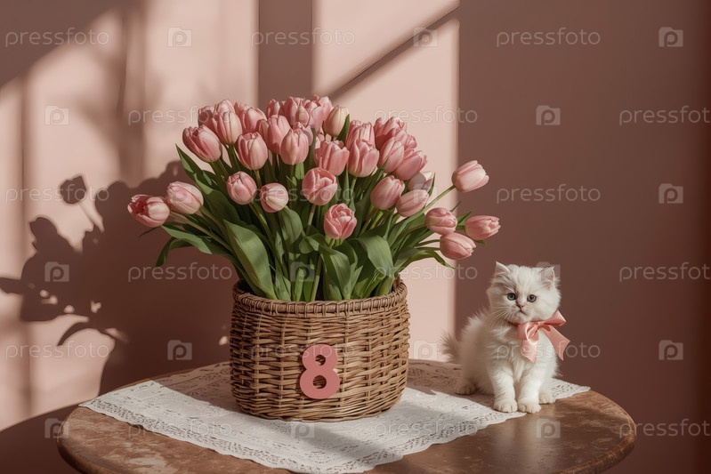 Концепция празднования Международного женского дня 8 марта. букет розовых тюльпанов в плетеновой корзине и белый котенок на столе у окна