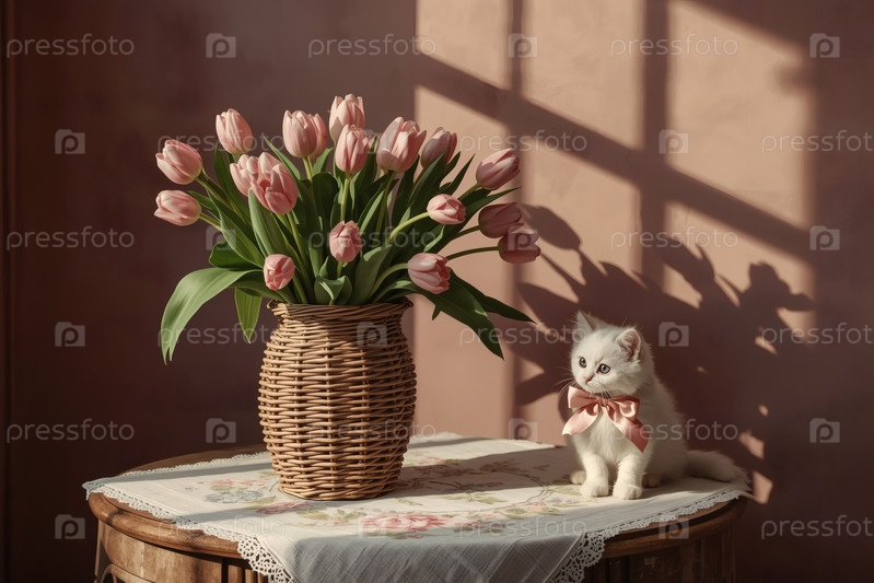 Концепция празднования Международного женского дня 8 марта. букет розовых тюльпанов в плетеновой корзине и белый котенок на столе у окна