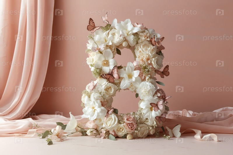 Международный женский день. баннер, флаер, красивая открытка на 8 марта. цветы в форме цифры восемь и бабочки на простом фоне