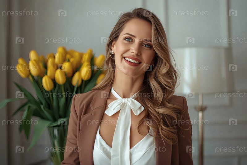 Концепция праздника, посвященного Международному женскому дню 8 марта.Молодая женщина в элегантном платье с луком держит букет желтых тюльпанов в ярком интерьере