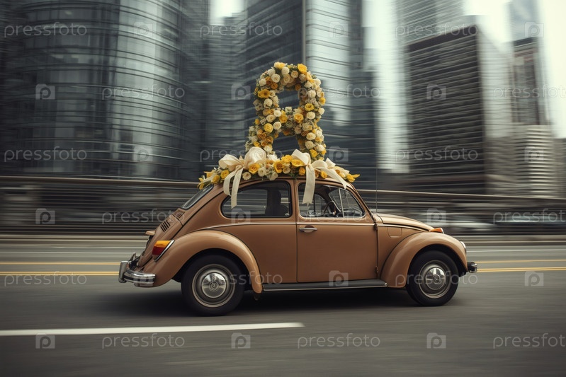 Концепция праздника, посвященного Международному женскому дню 8 марта. бежевый ретро-автомобиль с цветной аранжировкой в форме восьмерки на крыше, движущийся по улице города, окруженной небоскребами