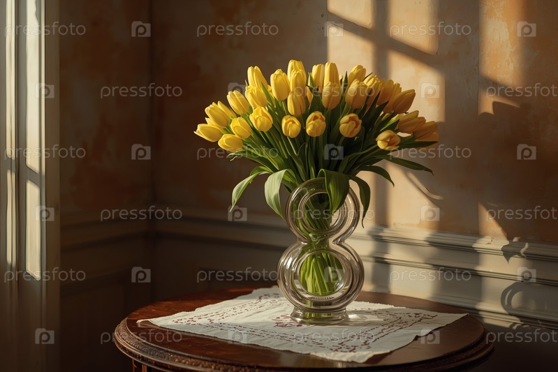 Концепция празднования Международного женского дня 8 марта. букет желтых тюльпанов в стеклянной вазе на столе у окна