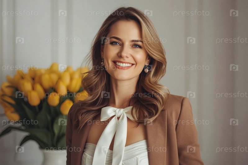 Концепция праздника, посвященного Международному женскому дню 8 марта.Молодая женщина в элегантном платье с луком держит букет желтых тюльпанов в ярком интерьере