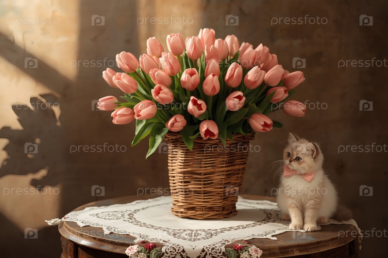Концепция празднования Международного женского дня 8 марта. букет розовых тюльпанов в плетеновой корзине и белый котенок на столе у окна