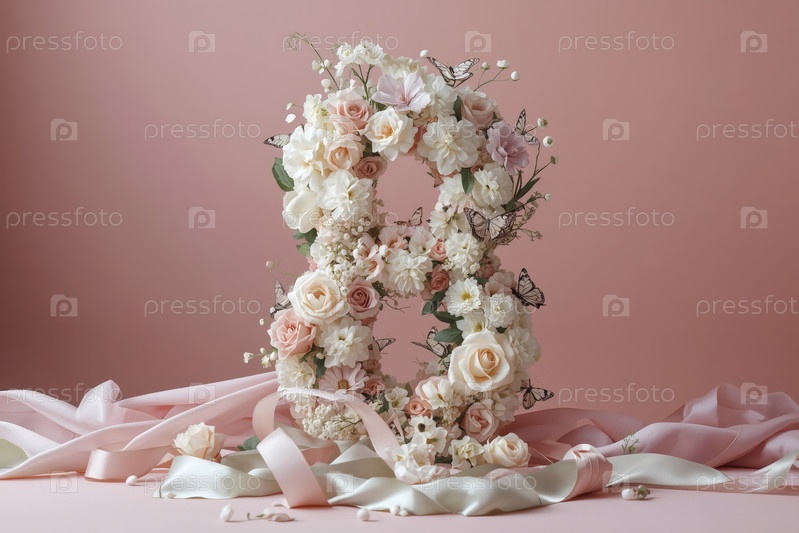 Международный женский день. баннер, флаер, красивая открытка на 8 марта. цветы в форме цифры восемь и бабочки на простом фоне