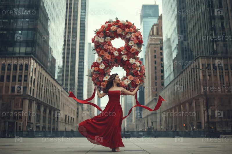 Концепция праздника, посвященного Международному женскому дню 8 марта.Женщина в платье держит огромную цветочную восьмерку на городской улице, окруженной небоскребами