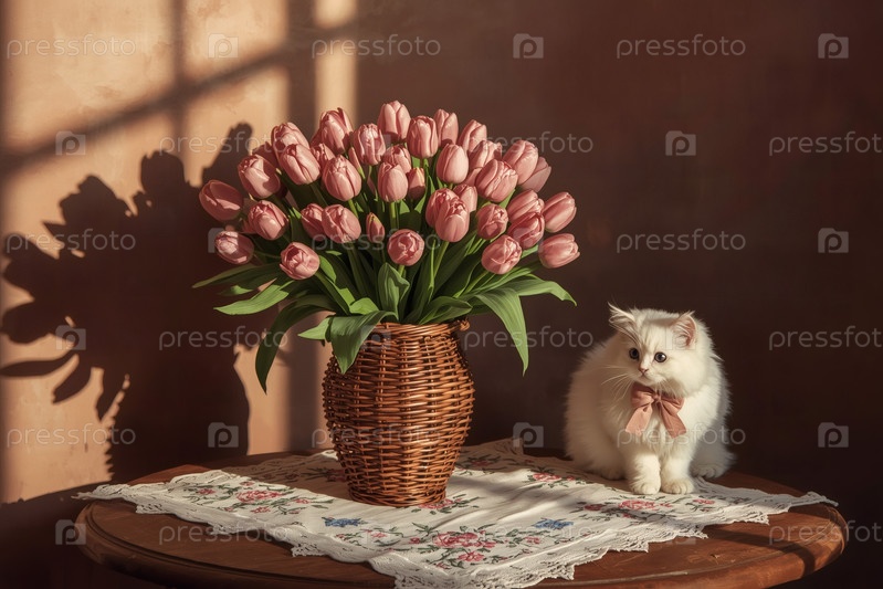 Концепция празднования Международного женского дня 8 марта. букет розовых тюльпанов в плетеновой корзине и белый котенок на столе у окна