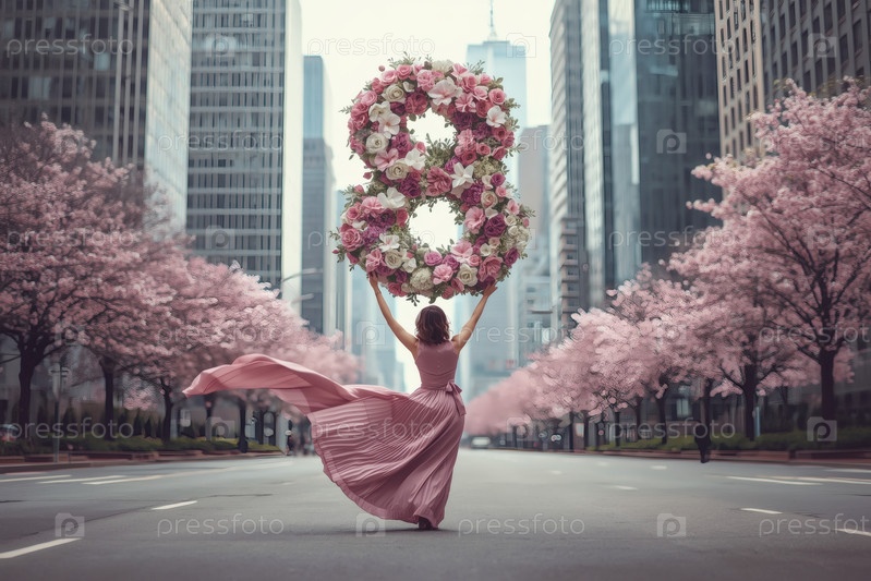 Концепция праздника, посвященного Международному женскому дню 8 марта.Женщина в платье держит огромную цветочную восьмерку на городской улице, окруженной небоскребами