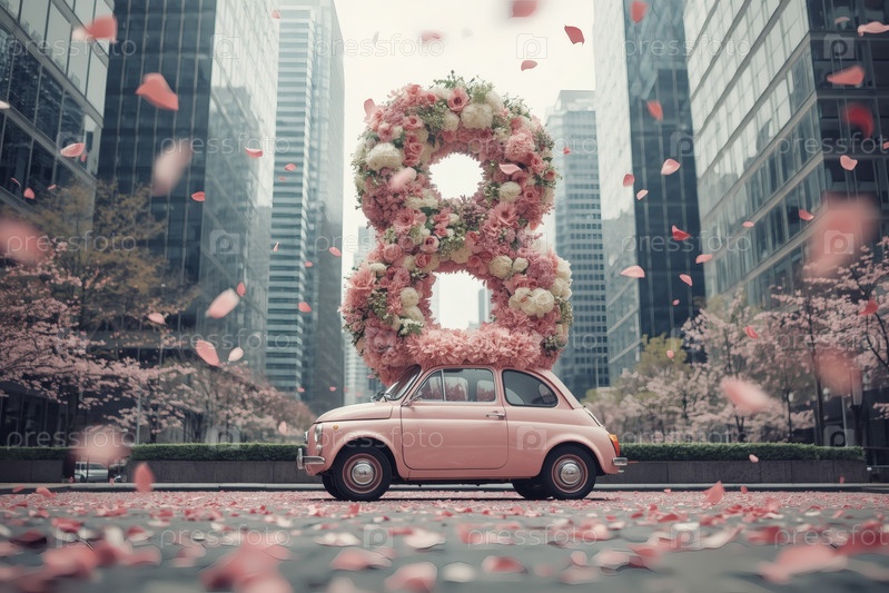 Концепция праздника Международного женского дня 8 марта.Розовый ретро-автомобиль с цветной аранжировкой в форме восьмерки на крыше, движущийся по улице города среди небоскребов