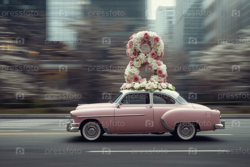 Концепция праздника Международного женского дня 8 марта.Розовый ретро-автомобиль с цветной аранжировкой в форме восьмерки на крыше, движущийся по улице города среди небоскребов