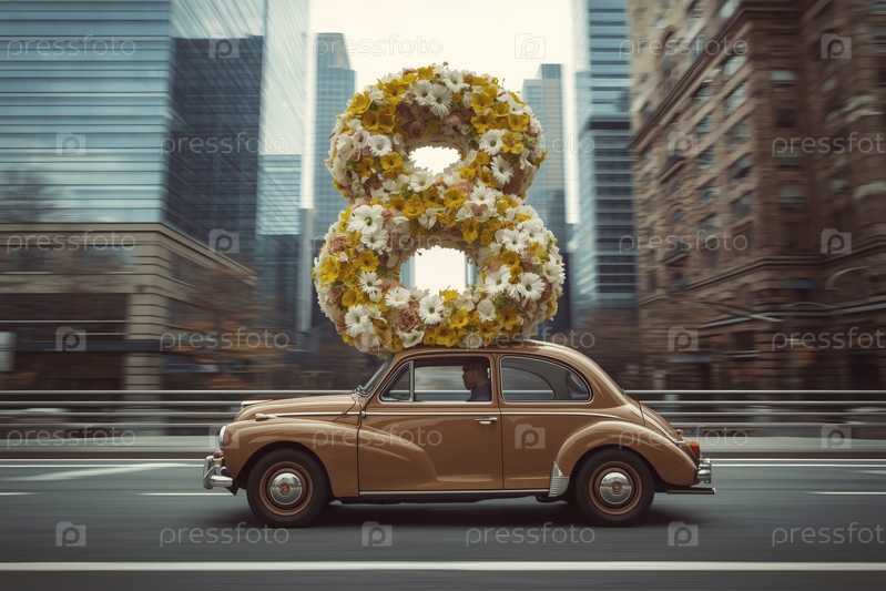 Концепция праздника, посвященного Международному женскому дню 8 марта. бежевый ретро-автомобиль с цветной аранжировкой в форме восьмерки на крыше, движущийся по улице города, окруженной небоскребами