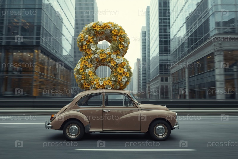 Концепция праздника, посвященного Международному женскому дню 8 марта. бежевый ретро-автомобиль с цветной аранжировкой в форме восьмерки на крыше, движущийся по улице города, окруженной небоскребами