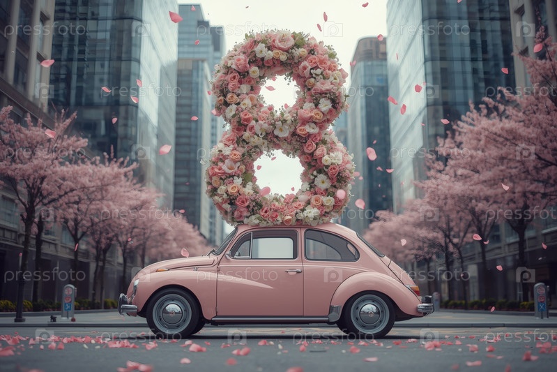 Концепция праздника Международного женского дня 8 марта.Розовый ретро-автомобиль с цветной аранжировкой в форме восьмерки на крыше, движущийся по улице города среди небоскребов
