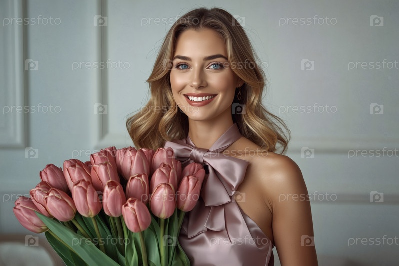 Концепция праздника, посвященного Международному женскому дню 8 марта.Молодая женщина в розовом элегантном платье с луком держит букет белых и розовых тюльпанов в ярком интерьере