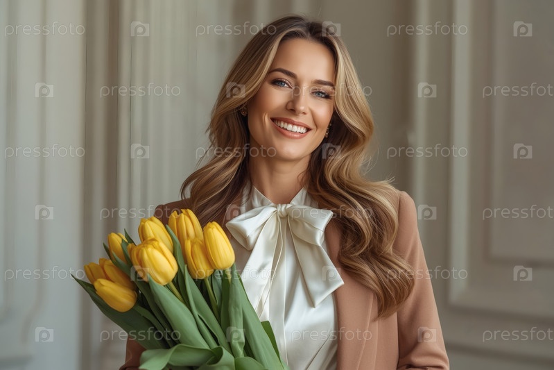 Концепция праздника, посвященного Международному женскому дню 8 марта.Молодая женщина в элегантном платье с луком держит букет желтых тюльпанов в ярком интерьере