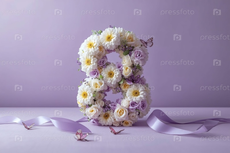 Международный женский день. баннер, флаер, красивая открытка на 8 марта. цветы в форме цифры восемь и бабочки на простом фоне