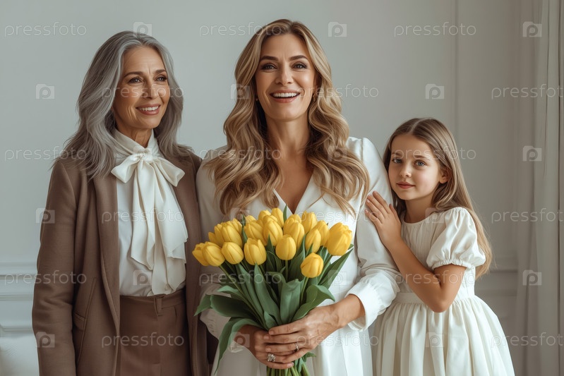 Концепция праздника, посвященного Международному женскому дню 8 марта.Три поколения женщин.Молодая женщина, несущая букет тюльпанов, в сопровождении пожилой матери и маленькой дочери