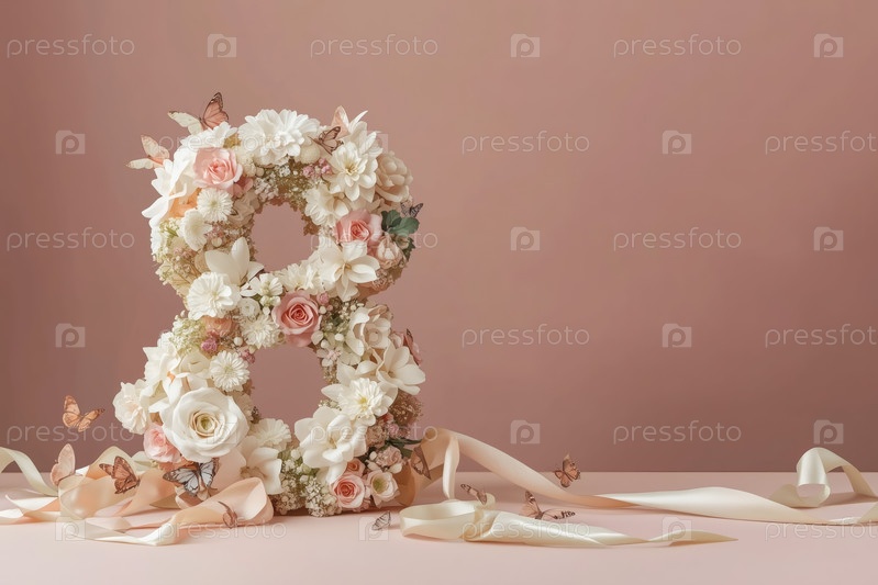 Международный женский день. баннер, флаер, красивая открытка на 8 марта. цветы в форме цифры восемь и бабочки на простом фоне
