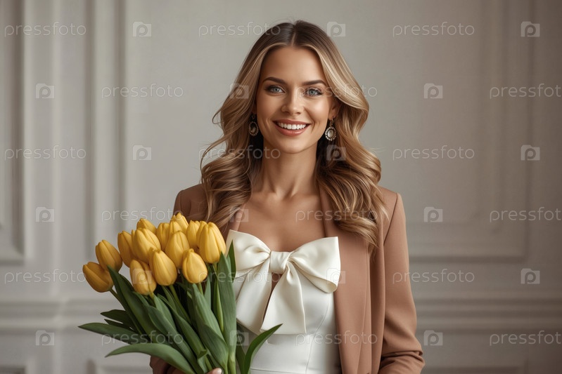 Концепция праздника, посвященного Международному женскому дню 8 марта.Молодая женщина в элегантном платье с луком держит букет желтых тюльпанов в ярком интерьере