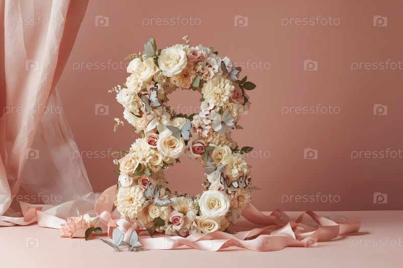 Международный женский день. баннер, флаер, красивая открытка на 8 марта. цветы в форме цифры восемь и бабочки на простом фоне