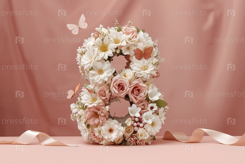 Международный женский день. баннер, флаер, красивая открытка на 8 марта. цветы в форме цифры восемь и бабочки на простом фоне