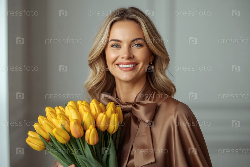 Концепция праздника, посвященного Международному женскому дню 8 марта.Молодая женщина в элегантном платье с луком держит букет желтых тюльпанов в ярком интерьере
