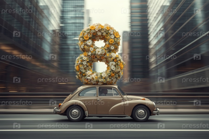 Концепция праздника, посвященного Международному женскому дню 8 марта. бежевый ретро-автомобиль с цветной аранжировкой в форме восьмерки на крыше, движущийся по улице города, окруженной небоскребами