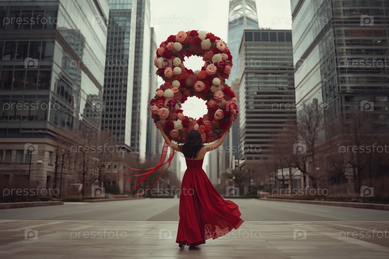 Концепция праздника, посвященного Международному женскому дню 8 марта.Женщина в платье держит огромную цветочную восьмерку на городской улице, окруженной небоскребами