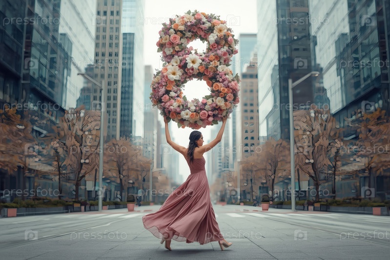 Концепция праздника, посвященного Международному женскому дню 8 марта.Женщина в платье держит огромную цветочную восьмерку на городской улице, окруженной небоскребами