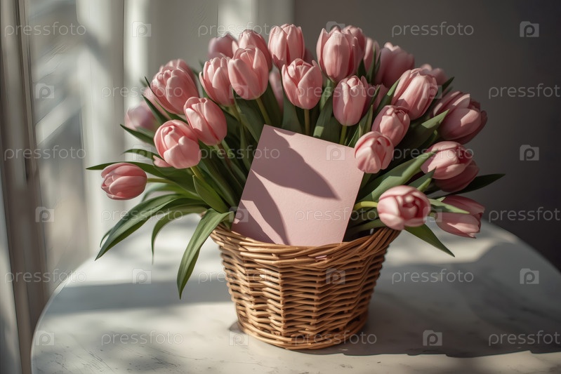 Концепция празднования Международного женского дня 8 марта. букет розовых тюльпанов в плетеновой корзине с номером 8 на столе у окна
