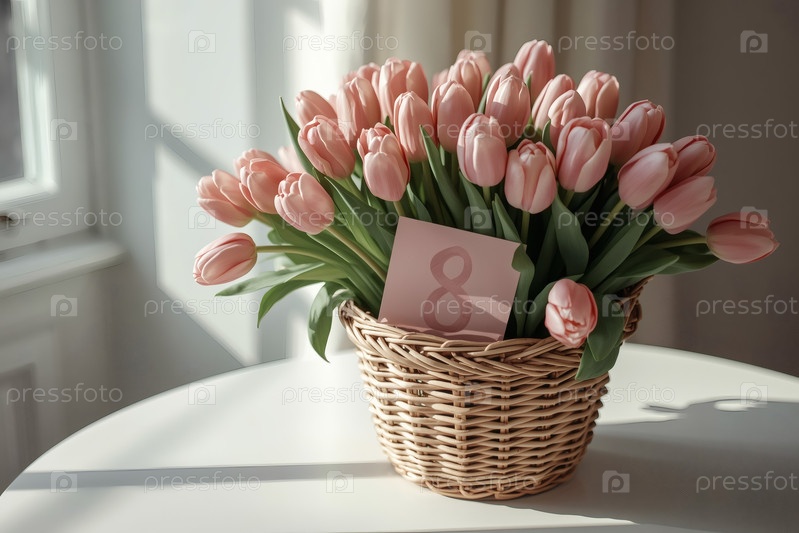 Концепция празднования Международного женского дня 8 марта. букет розовых тюльпанов в плетеновой корзине с номером 8 на столе у окна